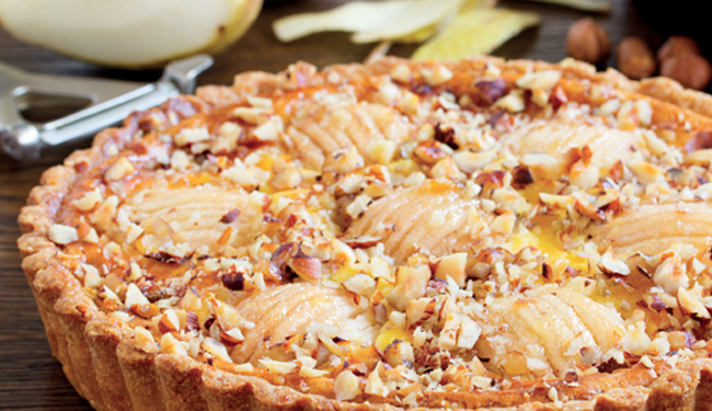 Recouvrir les poires de la crème d'amande. Ajouter les noisettes concasséees grossièrement. Cuire 20 à 30 min au four.