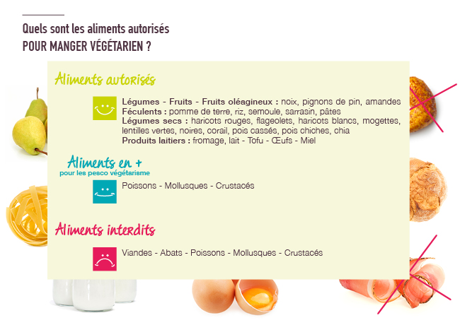Un végétarien va consommer des végétaux, des champignons et des aliments d’origine animale (comme le miel, les œufs, le lait ainsi que leurs produits dérivés). Il exclut donc les viandes, les volailles, les poissons et les fruits de mer. Exemple d’un menu végétarien sur une journée :